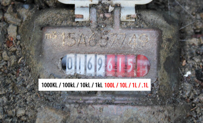 Step 3: Record the numbers in RED on the dial - these indicate 100's L / 10's L / 1L / and 0.1L as pictured. Then wait and read it again and compare the numbers. If the dial has turned and no one has been using water, then the water is running/leaking somewhere. See the photo below.